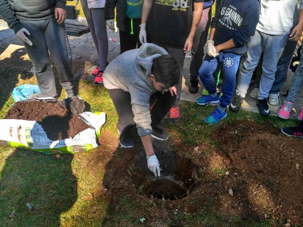 Οι μαθητές του πρώτου τμήματος της έκτης του 7ου Δημοτικού μαζί με το δάσκαλο τους Ηλία Θεοχάρη φύτεψαν το σφενδάμι στο παρκάκι, ενώ ενημερώθηκαν παράλληλα για τους ενδεδειγμένους τρόπους περιποίησής του.