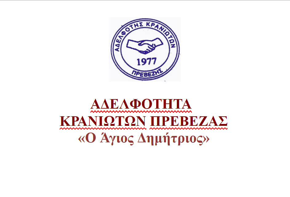 Το Δ.Σ. της Αδελφότητας Κρανιωτών Πρέβεζας «Ο Άγιος Δημήτριος» προσκαλεί τα μέλη του σε Τακτική Γενική Συνέλευση την Κυριακή 18 Μαρτίου 2018 και ώρα 11:00 στην αίθουσα του Δήμου Πρέβεζας (Θεοφάνειος αίθουσα τέχνης-Ισόγειο) στην κεντρική αγορά Πρέβεζας, με θέματα ημερήσιας διάταξης: