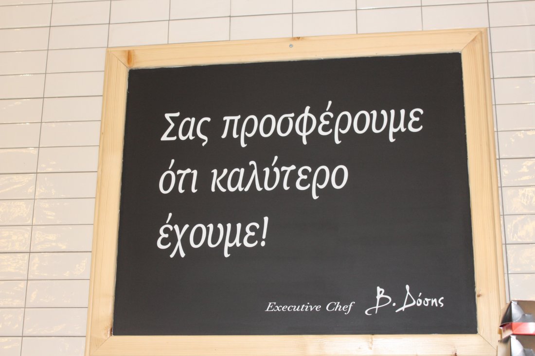 Ο Χώρος στον “Καλοφαγά” είναι μοναδικός, το ντεκόρ εξαιρετικό, οι παροχή υπηρεσιών ποιοτικές, όσο για τις γαστρονομικές απολαύσεις; Ο Βασίλης και οι συνεργάτες του, δεν έχουν ταβάνι. κάθε φορά που νομίζουμε ότι το… τερμάτισαν, έχουν τους τρόπους να μας εντυπωσιάζουν με τις ασύγκριτες νοστιμιές τους! Η φιλοσοφία, το μότο του καταστήματος με την υπογραφή, που φέρνει αν θέλετε την ποιοτική σφραγίδα του Βασίλη Δόση, τα λέει όλα: “Σας προσφέρουμε ότι καλύτερο έχουμε” Η συγκεκριμένη φράση μάλιστα, όπως βλέπετε και στη φωτογραφία υπάρχει και σε ευδιάκριτο σημείο του καταστήματος.