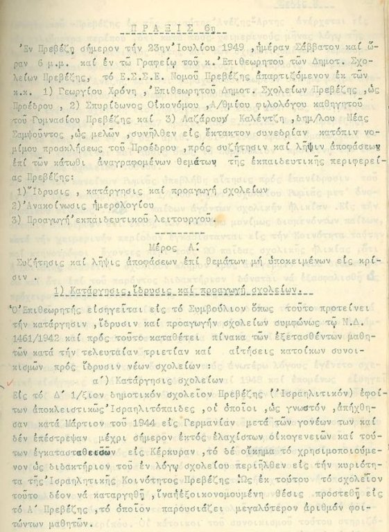 Η δεύτερη ιστορική συγκυρία που σκιαγραφείται μέσα από τα πρακτικά αφορά τον αφανισμό της μικρής εβραϊκής κοινότητας της Πρέβεζας κατά την γερμανική κατοχή. Στις 23-7-1949 το Υπηρεσιακό Συμβούλιο καταργεί το ισραηλιτικό σχολείο καθώς τα παιδιά που φοιτούσαν σε αυτό απήχθηκαν μαζί με τις οικογένειες τους τον Μάρτιο του 1944 και μεταφέρθηκαν στην Γερμανία χωρίς να επιστρέψουν, εκτός ελαχίστων οικογενειών οι οποίες εγκαταστάθηκαν στην Κέρκυρα. (εικ. 2).