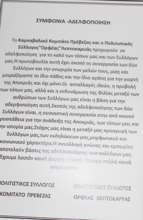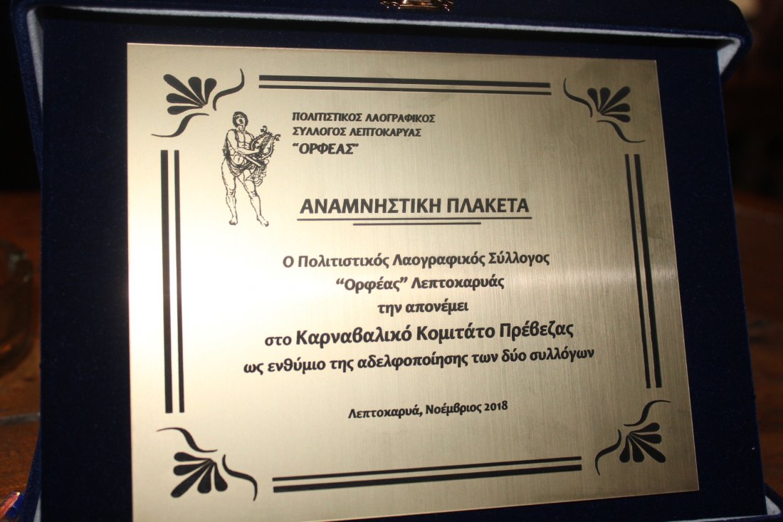 Μια Καρναβαλική στολή έγινε δώρο από το Κομιτάτο ενώ θα σταλούν και 10 CD που έχουν τον ύμνο του Καρναβαλικού Κομιτάτου Πρέβεζας και από το σύλλογο “ΟΡΦΕΑΣ” μία τιμητική πλακέτα. Κατά τη συζήτηση για να αναπτυχθεί συνεργασία από τις δύο πλευρές, από το σύλλογο ¨ΟΡΦΕΑΣ” Λεπτοκαρυάς συμμετείχαν οι Ζήσιος Δημήτρης. Κώστας Κατρανας. Αλέκος Παναγιωτίδης, Νίκος Τσαρούχας, Βαγγέλης Κουκαβάς. Από το Κομιτάτο, οι Σπύρος Παπαδιώτης, Θωμάς Τσούνης και Σπύρος Πλέουρας. Μετά την επίσκεψή τους πραγματοποιώντας ταξίδι σε Γιάννενα και Πρέβεζα, έπεσε η ιδέα για εκ νέου συνάντηση των δύο πολιτιστικών φορέων, είτε στη Λεπτοκαρυά Κατερίνης είτε σε …”ουδέτερο έδαφος” με εκδρομή που θα πραγματοποιήσει το Καρναβαλικό Κομιτάτο Πρέβεζας. Σε κάθε περίπτωση τέτοιες πρωτοβουλίες φέρνουν κοντά ανθρώπους διαφορετικών περιοχών της χώρας, ενώ σημαντικό ρόλο σε τέτοιες συναντήσεις παίζουν και οι αποκριάτικες δράσεις.