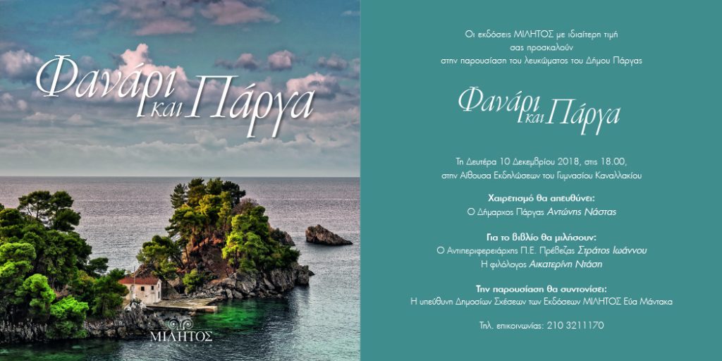 Τη Δευτέρα 10 Δεκεμβρίου 2018 και ώρα 18.00 στην αίθουσα εκδηλώσεων του Γυμνασίου Καναλλακίου. Χαιρετισμό θα απευθύνει ο δήμαρχος Πάργας Αντώνης Νάστας. Για το βιβλίο θα μιλήσουν ο Αντιπεριφερειάρχης Π.Ε. Πρέβεζας Στράτος Ιωάννου και η φιλόλογος Κατερίνα Ντάση.