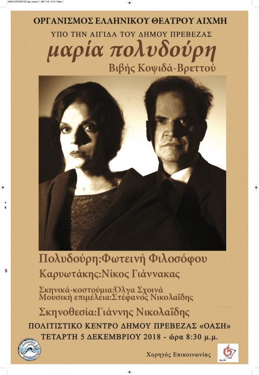 Η παράσταση “Μαρία Πολυδούρη” θα παρουσιαστεί την Τετάρτη 5 Δεκεμβρίου ώρα 8.30 το βράδυ στην αίθουσα του Πολιτιστικού Κέντρου Πρέβεζας υπό την σκηνοθετική ματιά του Γιάννη Νικολαϊδη με κεντρικά πρόσωπα την Φωτεινή Φιλοσόφου (στο ρόλο της Μαρίας Πολυδούρη)και του Νίκου Γιαννακά (στο ρόλο του Κώστα Καρυωτάκη).