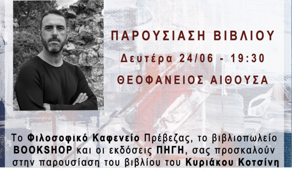 Το Φιλοσοφικό Καφενείο στην Πρέβεζα παρουσιάζει το πρώτο βιβλίο του Πρεβεζάνου Κυριάκου Κοτσίνη με τον τίτλο “Περισσότερο χρόνο”, από τις Πρότυπες Εκδόσεις Πηγή.