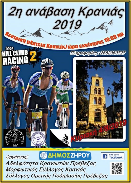 Σας γνωρίζουμε ότι η Αδελφότητα Κρανιωτών Πρέβεζας, ο Μορφωτικός Σύλλογος Κρανιάς, ο Σύλλογος Ορεινής Ποδηλασίας Πρέβεζας σε συνεργασία με το Δήμο Ζηρού διοργανώνουν την 2η Ποδηλατική Ανάβαση Κρανιάς.   Ο αγώνας θα πραγματοποιηθεί την Κυριακή 4 Αυγούστου 2019, με ώρα εκκίνησης στις 10 π.μ.