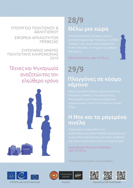 Το θέμα εορτασμού των ΕΗΠΚ για τη διετία 2019-2020 είναι «Τέχνες και Ψυχαγωγία – αναζητώντας τον ελεύθερο χρόνο», ένα θέμα διαχρονικό, ευρύτατο και πολυδιάστατο. Η Εφορεία Αρχαιοτήτων Πρέβεζας συμμετέχει στον φετινό εορτασμό με τις ακόλουθες δράσεις: