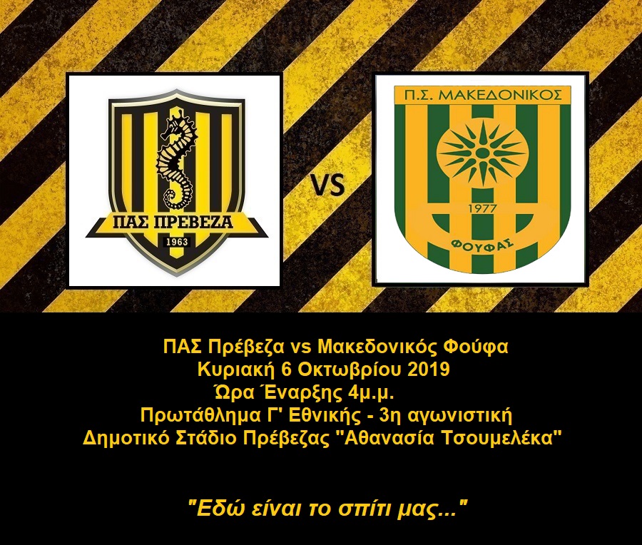 Έπειτα από δύο νίκες σε ισάριθμες αναμετρήσεις για τον 4ο Όμιλο της Γ’ Εθνικής, ο ΠΑΣ Πρέβεζα υποδέχεται στο “Αθανασία Τσουμελέκα” την Κυριακή 6 Οκτωβρίου 2019 και ώρα 4μ.μ. τον Μακεδονικό Φούφας για την 3η αγωνιστική του πρωταθλήματος.