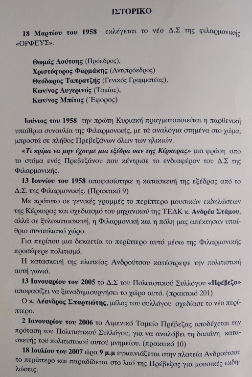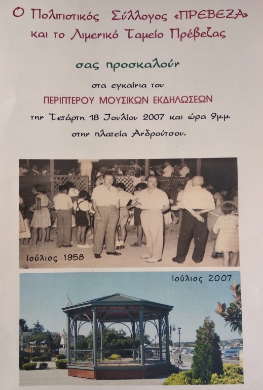 Τέλος το Περίπτερο Μουσικών Εκδηλώσεων της Φιλαρμονικής που ο Σύλλογός μας με την καταλυτική βοήθεια του Λιμενικού Ταμείου, επί προεδρίας του δικηγόρου Τάσση Απόστολου, επανατοποθέτησε στην πλατεία Ανδρούτσου στην 18/07/2007, πιστεύουμε ότι πρέπει να είναι ο πυρήνας μιας σειράς μουσικών εκδηλώσεων του μουσικού κόσμου της Πρέβεζας υπό την αιγίδα του Δήμου για τον εορτασμό των 100 χρόνων της Φιλαρμονικής μας.