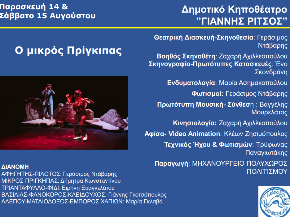 Σε σκηνοθεσία του Πρεβεζάνου Καλλιτέχνη Γεράσιμου Ντάβαρη, έρχεται στο Δημοτικό Κηποθέατρο Πρέβεζας “Γιάννης Ρίτσος” 14 & 15 Αυγούστου ο “Μικρός Πρίγκηπας”.