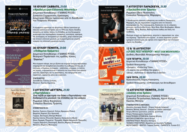 Η “αυλαία”άνοιξε την Κυριακή 18/7 με τη βραδιά Ελληνικής Μουσικής από τη Συμφωνική Ορχήστρα του Δημοτικού Ωδείου Ιωαννίνων ενώ ακολουθούν μαγικές καλοκαιρινές βραδιές το πρόγραμμα των οποίων σας επισυνάπτεται.