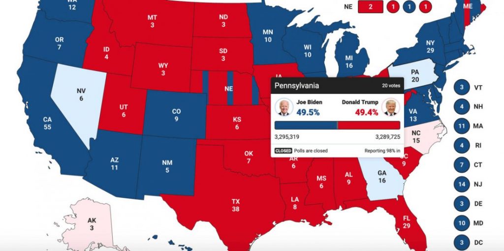 Μετά την ανατροπή στην Τζόρτζια, νωρίτερα, ο Τζο Μπάιντεν έκανε την ανατροπή και στην Πενσιλβάνια. Την πολιτεία που δίνει 20 εκλέκτορες και ήταν η μοναδική που χρειαζόταν για να νικήσει τον Ντόναλντ Τραμπ. Από την ώρα που έκλεισαν οι κάλπες στις αμερικανικές εκλογές , ο νυν πρόεδρος προηγούνταν σταθερά στην Πενσιλβάνια.