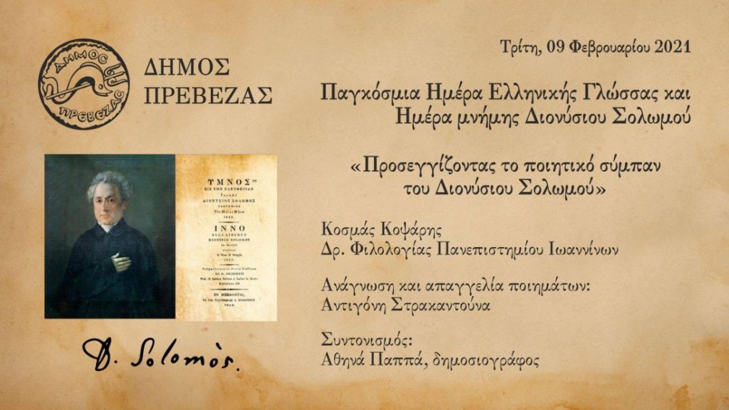 Σήμερα Τρίτη 9 Φεβρουαρίου ,ημέρα μνήμης του εθνικού μας ποιητή Διονύσιου Σολωμού και Παγκόσμια Ημέρα Ελληνικής Γλώσσας ο Δήμος Πρέβεζας “ανοίγει” την αυλαία των εκδηλώσεων που θα πραγματοποιηθούν με αφορμή τα 200 χρόνια από την Επανάσταση του 1821. Την ξεχωριστή αυτή ημέρα για την Πρέβεζα , παραμονή και του εορτασμού του Πολιούχου της Αγίου Χαραλάμπους στις 18:30” μέσω του καναλιού του Δήμου στο youtube, θα μεταδοθεί μια επετειακή διαδικτυακή εκδήλωση με θέμα: “Προσεγγίζοντας το ποιητικό σύμπαν του Διονύσιου Σολωμού” με ομιλητή τον Κοσμά Κοψάρη διδάκτορ Φιλολογίας του Πανεπιστημίου Ιωαννίνων και την Αντιγόνη Στρακαντούνα σε απαγγελία έργων του εθνικού μας ποιητή.
