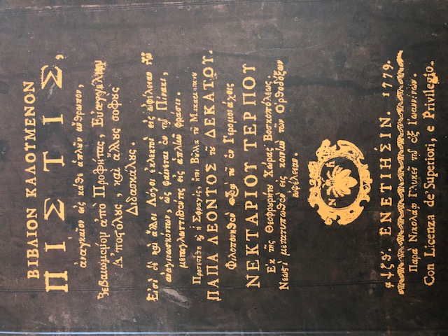 - Το «βιβλίον καλούμενον ΠΙΣΤΗΣ» του Μοσχοπολίτη Νεκταρίου Τέρπου, στην επανέκδοση του 1779 που έγινε από τον Νικόλαο Γλυκή τον εξ Ιωαννίνων. Το βιβλίο εκδόθηκε αρχικά το 1732 στη Βενετία και επανεκδόθηκε πολλές φορές,