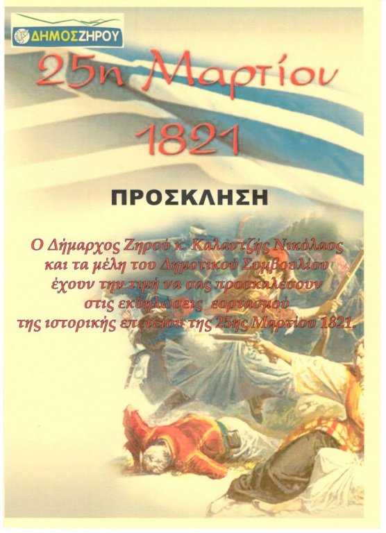 Δήμος Ζηρού: ΠΡΟΣΚΛΗΣΗ ΓΙΑ ΤΙΣ ΕΚΔΗΛΩΣΕΙΣ ΤΗΣ 25ης ΜΑΡΤΙΟΥ 2021
