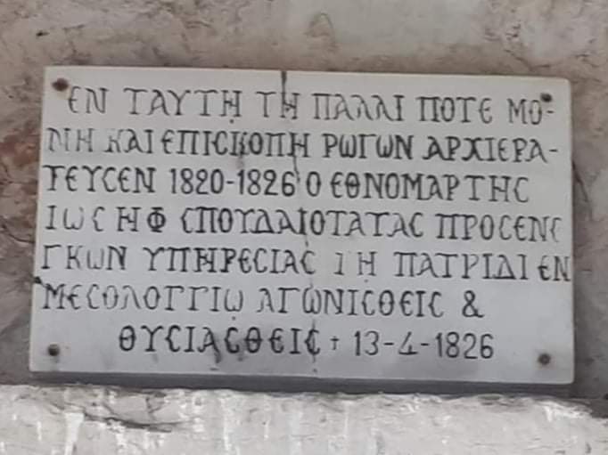 «ΕΝ ΤΑΥΤΗ ΤΗΝ ΠΑΛΑΙ ΜΟΝΗ ΚΑΙ ΕΠΙΣΚΟΠΗ ΡΩΓΩΝ ΑΡΧΙΕΡΑΤΕΥΣΕ 1820-1826 Ο ΕΘΝΟΜΑΡΤΥΡΑΣ ΙΩΣΗΦ ΣΠΟΥΔΑΙΟΤΑΤΑΣ ΠΡΟΣΕΝΕΓΚΩΝ ΥΠΗΡΕΣΙΑΣ ΤΗ ΠΑΤΡΙΔΙ ΕΝ ΜΕΣΟΛΟΓΓΙΩ ΑΓΩΝΙΣΘΕΙΣ ΚΑΙ ΘΥΣΑΣΘΕΙΣ 13/04/1826».