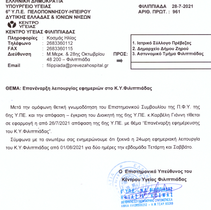 Μερική ικανοποίηση προκαλεί η απόφαση του διοικητή της 6ης ΥΠΕ κ. Γιάννη Καρβέλη για επανέναρξη από την 1η Αυγούστου, των εφημεριών στο Κέντρο Υγείας Φιλιππιάδας. Πιο συγκεκριμένα, σύμφωνα με την απόφαση της 6ης Υ.Π.Ε. το Κέντρο Υγείας θα εφημερεύει σε 24ωρη βάση δύο ημέρες της εβδομάδας, κάθε Τετάρτη και Σάββατο.