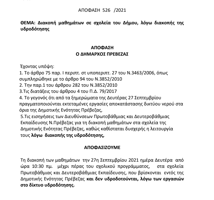 Ετικέτες: Δήμου Πρέβεζας, Διακοπή, διακοπής, Λειτουργίας, μαθημάτων, νερού, σχολεία