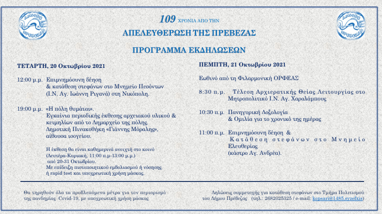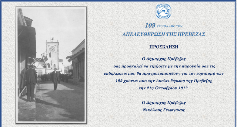 Με αφορμή την συμπλήρωση 109 χρόνων από την Απελευθέρωσή της Πρέβεζας , ο Δήμος διοργανώνει εκδηλώσεις μνήμης την Τετάρτη 20 και την Πέμπτη 21 Οκτωβρίου.