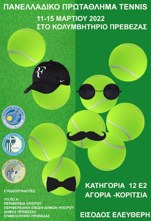 Ξεκινάει την Παρασκευή 11 Μαρτίου 2022 στα γήπεδα του Δημοτικού Κολυμβητηρίου Πρέβεζας το Πανελλαδικό Πρωτάθλημα Τένις Ε2 10η 2022 αγόρια – κορίτσια κατηγορίας 12 ετών μονά – διπλά.