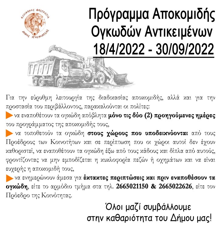 Η Υπηρεσία Καθαριότητας του Δήμου Ηγουμενίτσας ενημερώνει τους πολίτες ότι για το χρονικό διάστημα: από 18 Απριλίου 2022 έως και 30 Σεπτεμβρίου 2022 η αποκομιδή ογκωδών αστικών αποβλήτων (παλαιά έπιπλα, άχρηστες μικρές οικιακές συσκευές, στρώματα, φελιζόλ, ξύλινα κιβώτια κλπ) θα πραγματοποιείται αποκλειστικά στις προκαθορισμένες ημερομηνίες ανά περιοχή, σύμφωνα με το πρόγραμμα που ακολουθεί.
