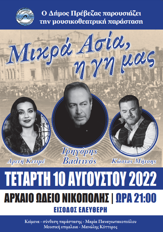 Μια ξεχωριστή εκδήλωση με τίτλο “Μικρά Ασία, η γη μας” παρουσιάζει ο Δήμος Πρέβεζας την Τετάρτη 10 Αυγούστου στο Αρχαίο Ωδείο Νικόπολης με είσοδο ελεύθερη για το κοινό.