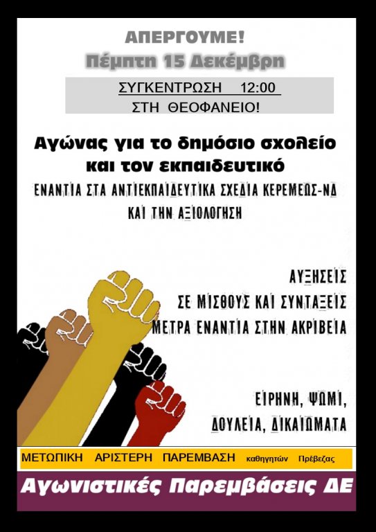 Γι’ αυτό και την Πέμπτη 15 του Δεκέμβρη απεργούμε όλοι, κατεβαίνουμε στο δρόμο και αγωνιζόμαστε για να έχουν συνέχεια και προοπτική οι κινητοποιήσεις μας!