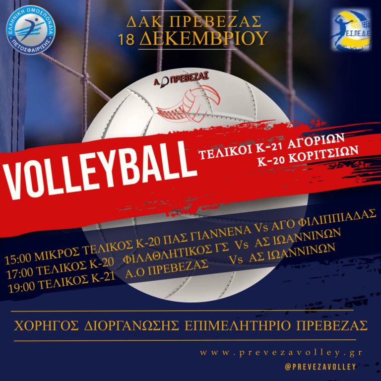 Ο Α.Ο Πρέβεζας ανακοινώνει την ανάληψη της διοργάνωσης των τελικών αγώνων πετοσφαίρισης(βόλεϊ) Κ21 αγοριών και Κ20 κοριτσιών που θα πραγματοποιηθούν στο ΔΑΚ Πρέβεζας την 18 Δεκεμβρίου 2022. Η πόλη της Πρέβεζας θα εκπροσωπηθεί στους τελικούς με την ομάδα Κ21 αγοριών του ΑΟΠ και την ομάδα Κ20 κοριτσιών του Φιλαθλητικού ΓΣ .