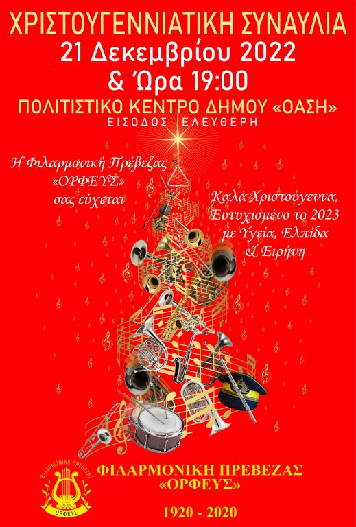Την Τετάρτη 21 Δεκεμβρίου πραγματοποιεί στο πολιτιστικό κέντρο “ΟΑΣΗ” Χριστουγενιάτικη συναυλία η φιλαρμονική “ΟΡΦΕΑΣ” Πρέβεζας ώρα 19.00.