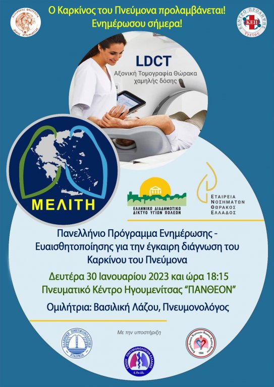 Το ΚΕΠ Υγείας του Δήμου Ηγουμενίτσας, το Ελληνικό Διαδημοτικό Δίκτυο Υγιών Πόλεων και η Εταιρεία Νοσημάτων Θώρακος Ελλάδος (ΕΝΘΕ) διοργανώνουν Ημερίδα Ενημέρωσης και Ευαισθητοποίησης για την Έγκαιρη Διάγνωση του Καρκίνου του Πνεύμονα με τον διακριτικό τίτλο «Μελίτη».