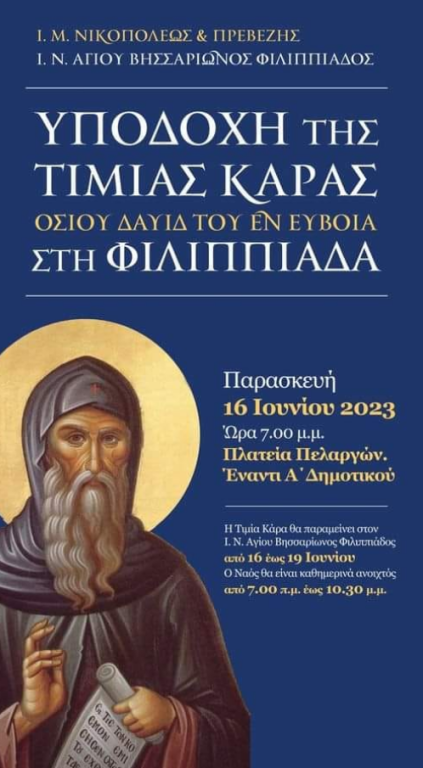 Ώρα 7:00 μ.μ. Επίσημη Υποδοχή της Τιμίας Κάρας του Οσίου Δαυίδ του εν Ευβοία, στην πλατεία Πελαργών. (Έναντι Α΄Δημοτικού σχολείου Φιλιππιάδος).