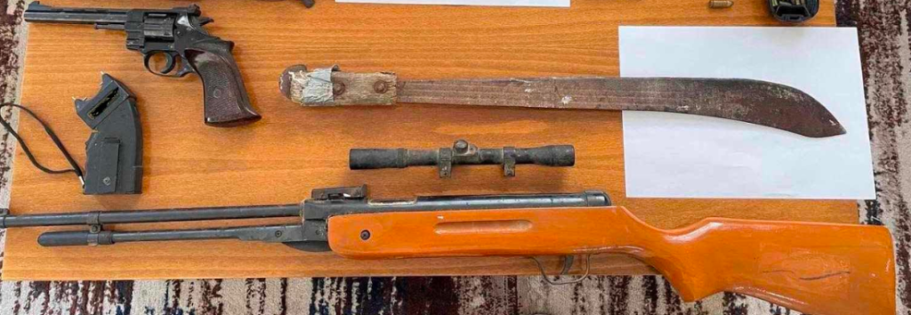 Σε έρευνα που ακολούθησε στην οικία του βρέθηκαν και κατασχέθηκαν, μεταξύ άλλων, περίστροφο διαμετρήματος 0,22 mm, αεροβόλο τυφέκιο, ξιφίδιο με μήκος λάμας (19) εκατοστών, μαχαίρι με μήκος λάμας (21) εκατοστών, κυνηγητική διόπτρα, συσκευή ηλεκτρικής εκκένωσης (taser), δεκαεπτά φυσίγγια με διαμέτρημα 0,22 mm και ένα των 9 mm