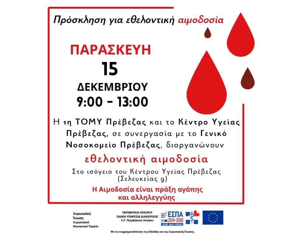 Εθελοντική αιμοδοσία διοργανώνουν την Παρασκευή 15 Δεκεμβρίου και ώρες 9π.μ-1μ.μ η 1η ΤΟΜΥ Πρέβεζας και το Κέντρο Υγείας Πρέβεζας σε συνεργασία με το Γενικό Νοσοκομείο.