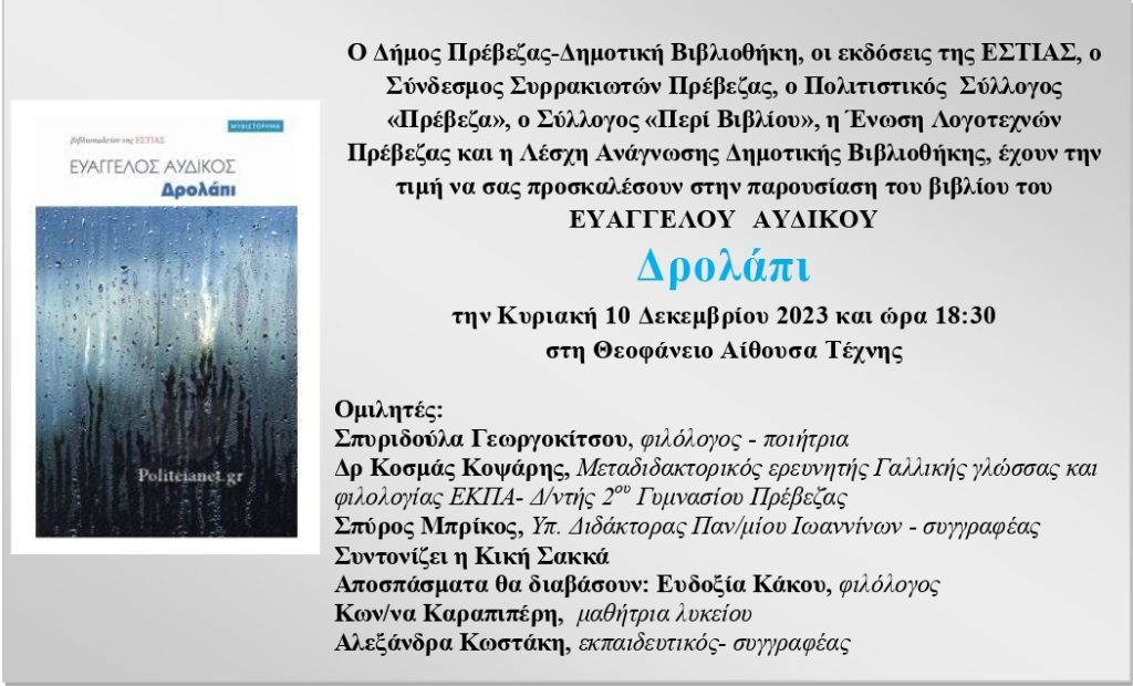 Ο Δήμος Πρέβεζας / Δημοτική Βιβλιοθήκη «Γυμνασιάρχης Χρ. Κοντός», ο Σύνδεσμος Συρρακιωτών Πρέβεζας, o Πολιτιστικός Σύλλογος « Πρέβεζα», ο Σύλλογος «Περί Βιβλίου» Πρέβεζας η Ένωση Λογοτεχνών Πρέβεζας, η Λέσχη Ανάγνωσης Δημοτικής Βιβλιοθήκης Πρέβεζας, Οι εκδόσεις Βιβλιοπωλείον της ΕΣΤΙΑΣ, και το βιβλιοπωλείο Bookshop συνδιοργανώνουν την παρουσίαση του καινούργιου μυθιστορήματος του Ευαγγέλου Αυδίκου, Δρολάπι, ΕΣΤΙΑ 2023