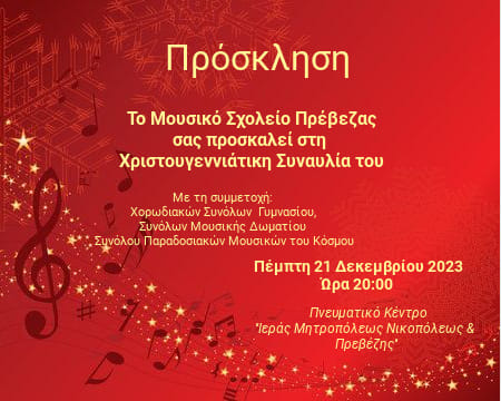 Το μουσικό σχολείο Πρέβεζας πραγματοποιεί την Χριστουγεννιάτικη συναυλία του την Πέμπτη 21 Δεκεμβρίου στο Πνευματικό κέντρο της Ιεράς Μητρόπολης Νικοπόλεως και Πρεβέζης ώρα