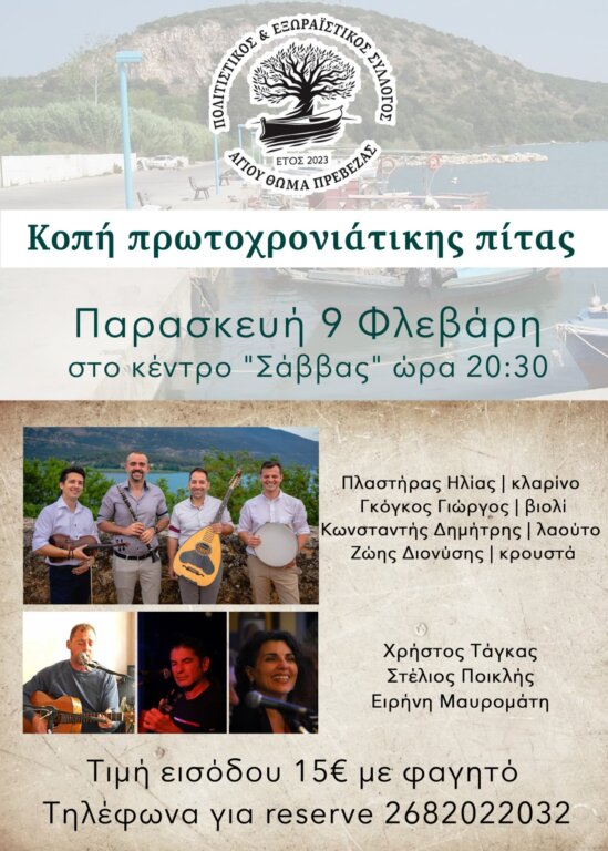 Ο Πολιτιστικός-Εξωραϊστικός σύλλογος του Αγίου Θωμά σας προσκαλεί στην κοπή της πρωτοχρονιάτικης πίτας την Παρασκευή 9 Φεβρουαρίου 2024 και ώρα 20.30 στο Κέντρο “Σάββας” στον Άγιο Θωμά.