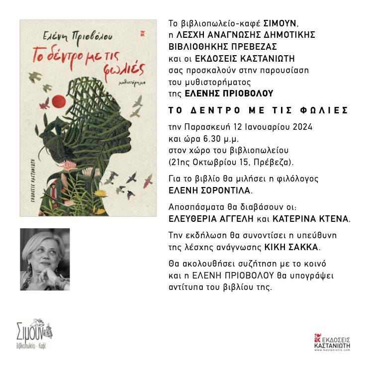 Στην παρουσίαση του μυθιστορήματος της Ελένης Πριοβόλου “Το δέντρο με τις φωλιές” σας προσκαλούν το βιβλιοπωλείο Σιμούν, η Λέσχη Ανάγνωσης Δημοτικής Βιβλιοθήκης Πρέβεζας και οι εκδόσεις Καστανιώτη.