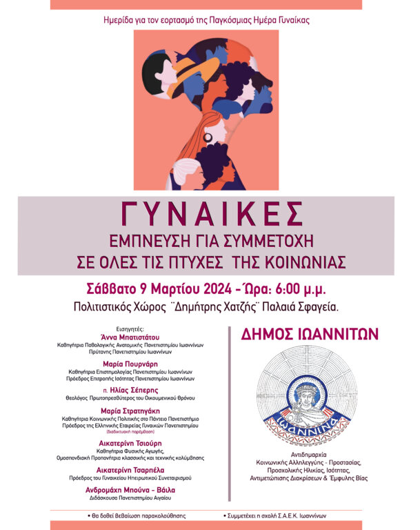 Ο δήμος Ιωαννιτών στο πλαίσιο του εορτασμού της Παγκόσμιας Ημέρας της Γυναίκας διοργανώνει ημερίδα με θέμα “Γυναίκες: Έμπνευση για συμμετοχή σε όλες τις πτυχές της κοινωνίας” το Σάββατο 9 Μαρτίου και ώρα 18.00 στην αίθουσα “Δ. Χατζής” στα παλαιά σφαγεία.