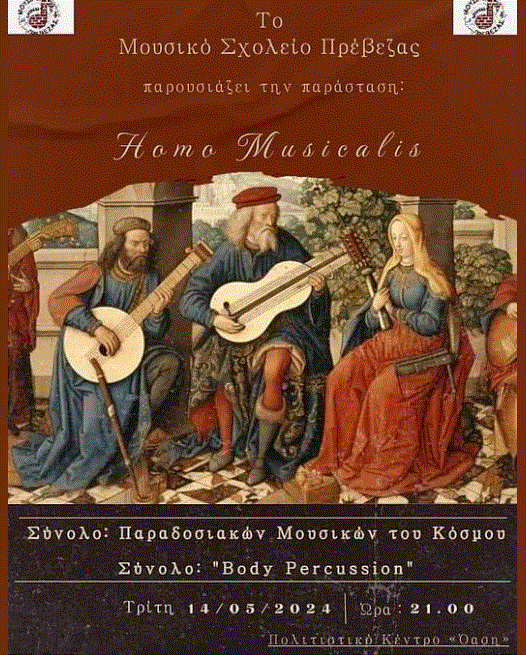 Στην παράσταση “Homo Musicalis” σας προσκαλεί το σύνολο “Παραδοσιακών Μουσικών του Κόσμου” και το σύνολο “Body Percussion” του Μουσικού Σχολείου Πρέβεζας την Τρίτη 14 Μαΐου και ώρα: 21:00, στο πολιτιστικό κέντρο Δήμου Πρέβεζας