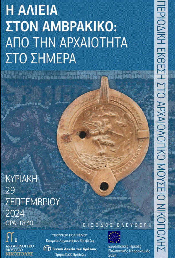 Eνα μοναδικό ταξίδι στο χρόνο με θέμα «Η Αλιεία στο Αμβρακικό: Από την Αρχαιότητα στο Σήμερα» υπό τη μορφή έκθεσης διοργανώνει η Εφορεία Αρχαιοτήτων Πρέβεζας σε συνεργασία με το τμήμα Γενικών Αρχείων Κράτους Πρέβεζας την Κυριακή 29 Σεπτεμβρίου, στις 18:30, στο Αρχαιολογικό Μουσείο Νικόπολης.