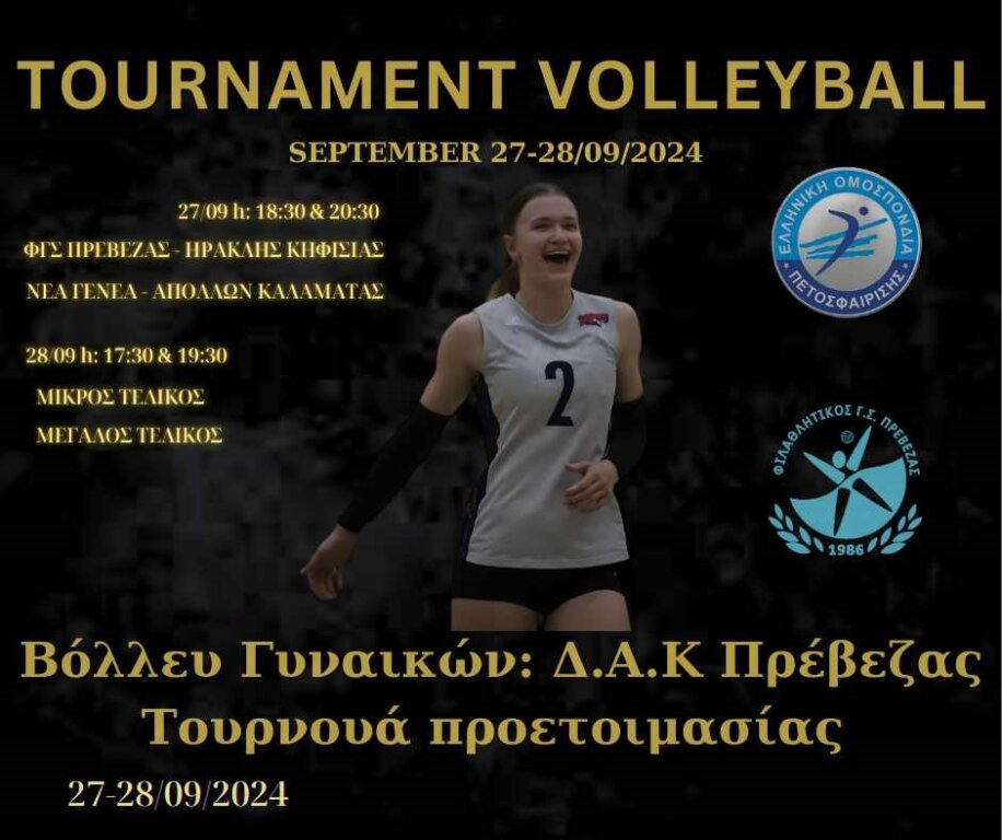 Λίγα εικοσιτετράωρα απομένουν για το τουρνουά βόλεϊ που πραγματοποιεί η ομάδα του Φ.Γ.Σ Πρέβεζας 27 και 28 Σεπτεμβρίου στο ΔΑΚ Πρέβεζας με την συμμετοχή των ομάδων, Ηρακλής Κηφισιάς, Νέα Γενεά και Απόλλωνα Καλαμάτας.