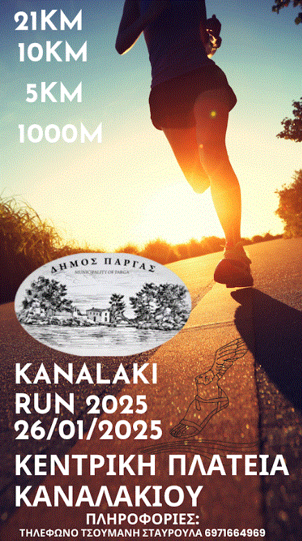 Ο Δήμος Πάργας στα πλαίσια θεσμοθέτησης αθλητικών εκδηλώσεων με κύριο στόχο την ανάπτυξη του μαζικού λαϊκού αθλητισμού και την προβολή της περιοχής, διοργανώνει στις 26/01/2025 δρομικό event με την ονομασία « Kanalaki Run 2025». Ο αγώνας θα έχει ως αφετηρία την Κεντρική Πλατεία Καναλακίου.