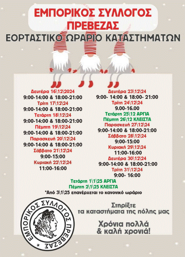 Εμπορικός Σύλλογος Πρέβεζας: Εορταστικό ωράριο