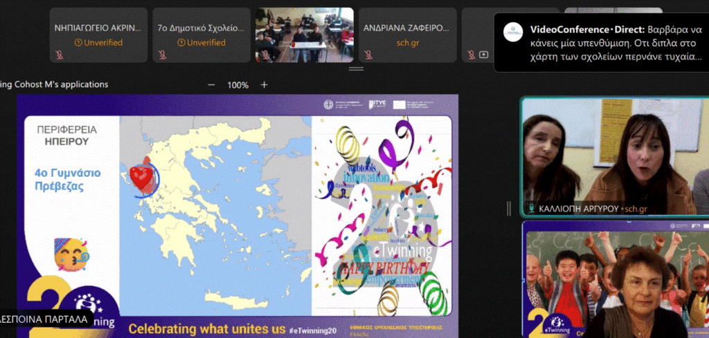 Στον εορτασμό των 20ων γενεθλίων της πανευρωπαϊκής δράσης eTwinning συμμετείχε διαδικτυακά αντιπροσωπεία του 4ου Γυμνασίου Πρέβεζας αποτελούμενη από εκπαιδευτικούς και την μαθητική ομάδα του eTwinning Club του σχολείου.