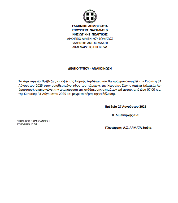 Ετικέτες: γιορτή, Κυκλοφοριακές, Λιμεναρχείο, Πρέβεζας, ρυθμίσεις, σαρδέλας