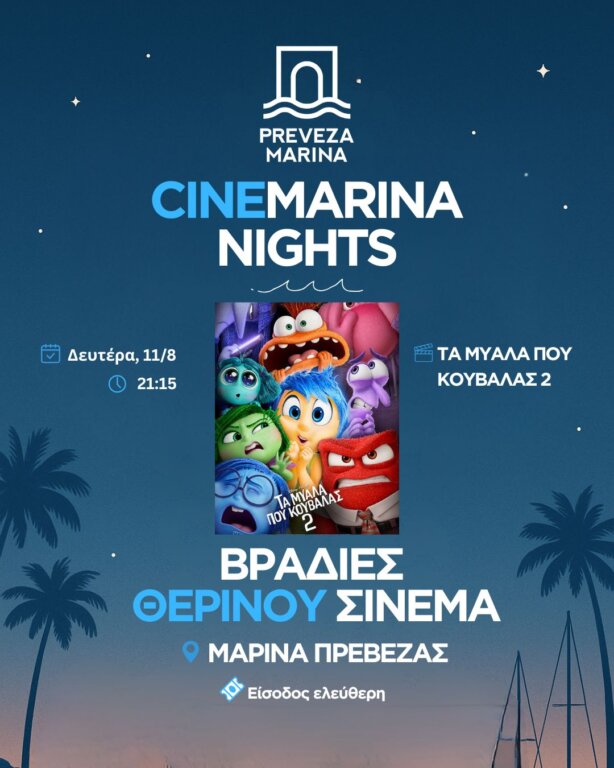 Τις προβολές διοργανώνει η Μαρίνα Πρέβεζας, με στόχο οι CINEMARINA NIGHTS να γίνουν ένας νέος θεσμός πολιτισμού και ψυχαγωγίας στην πόλη της Πρέβεζας.