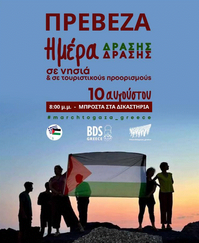 • Καθώς εκατομμύρια τουρίστες κατακλύζουν τη χώρα, ας κάνουμε την παρουσία μας ορατή και ηχηρή. Ας μετατρέψουμε τα νησιά, τις παραλίες, τα σοκάκια, τις βουνοκορφές και τα καταφύγια σε τόπους αλληλεγγύης — όχι χαλάρωσης για τους δολοφόνους στρατιώτες του IDF. Η οργανωμένη προσπάθεια να γίνει η Ελλάδα «καταφύγιο» για όσους συμμετέχουν ή στηρίζουν τη σφαγή στην Παλαιστίνη δεν θα περάσει!