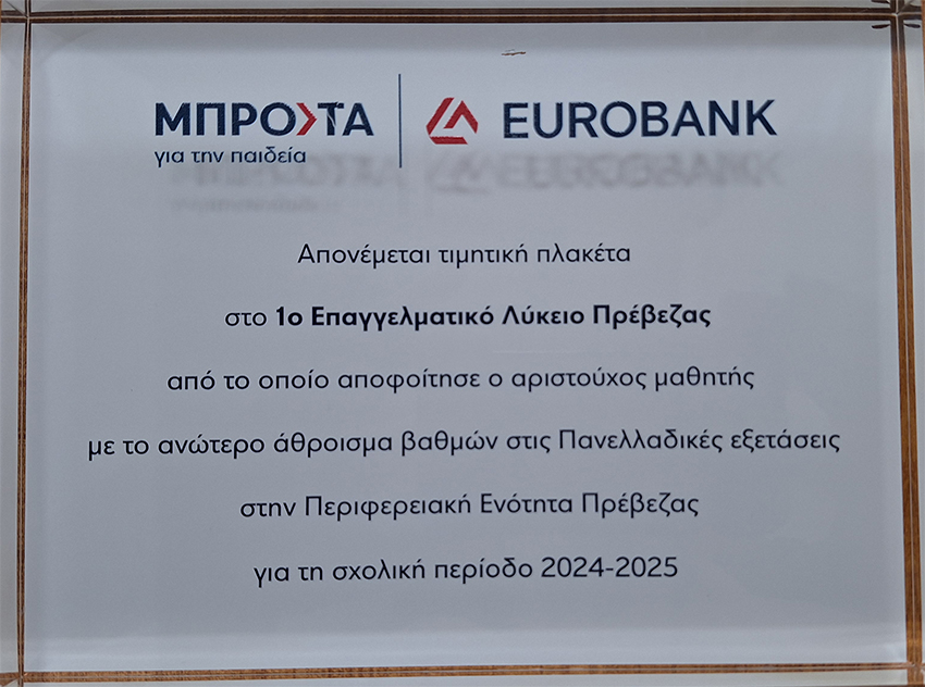 Το 1ο ΕΠΑΛ Πρέβεζας τιμήθηκε για μια ακόμη χρονιά σε ειδική εκδήλωση που πραγματοποιήθηκε στα Ιωάννινα την Παρασκευή 7 Νοεμβρίου για την άριστη επίδοση του μαθητή Βασίλειου Μαρτίδη, ο οποίος διακρίθηκε με την επίδοσή του στις Πανελλαδικές Εξετάσεις 2025. Τα βραβεία για τους αριστούχους μαθητές/τριες και η τιμητική πλακέτα απονεμήθηκαν από τη Eurobank στο πλαίσιο της πρωτοβουλίας “Μπροστά για την Παιδεία”. Την πλακέτα παρέλαβε ο διευθυντής του σχολείου κ. Καγκελάρης Νικόλαος.