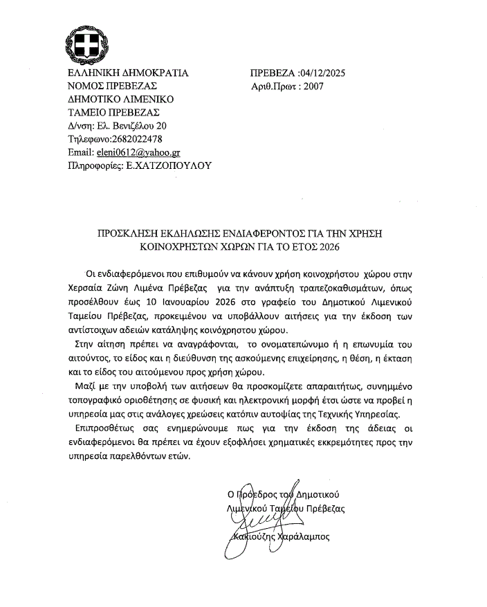Δημοτικό Λιμενικό Ταμείο Πρέβεζας: Πρόσκληση εκδήλωσης ενδιαφέροντος για τη χρήση κοινόχρηστων χώρων