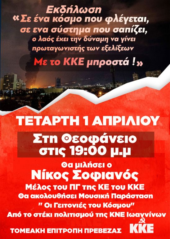 Η Τομεακή Επιτροπή Πρέβεζας του ΚΚΕ διοργανώνει εκδήλωση – συζήτηση με τίτλο: «Σε έναν κόσμο που φλέγεται, σε ένα σύστημα που σαπίζει, ο λαός μπορεί να γίνει πρωταγωνιστής των εξελίξεων – Με το ΚΚΕ μπροστά!»