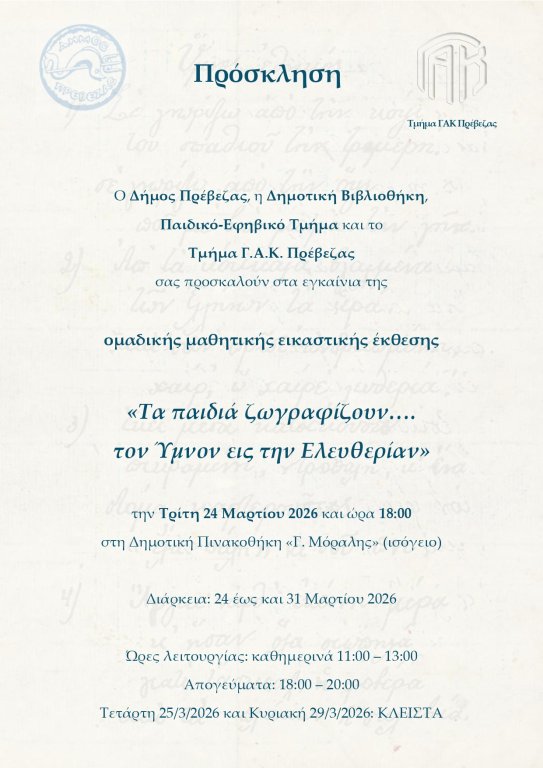 Εγκαινιάζεται την Τρίτη 24 Μαρτίου 2026 στις 18:00, στη Δημοτική Πινακοθήκη «Γιάννης Μόραλης» (Οικία Αθανασιάδη), η ομαδική μαθητική εικαστική έκθεση «Τα παιδιά ζωγραφίζουν… τον Ύμνον εις την Ελευθερίαν».